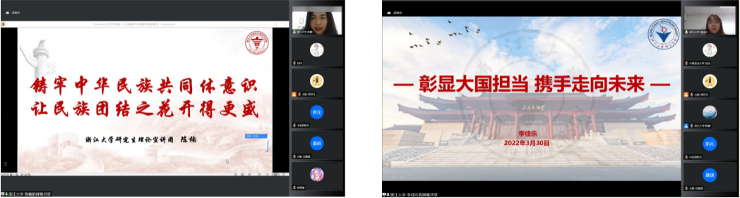 浙江大学研究生理论宣讲团讲师、动物科学公司2019级博士生陈楠作主题为“铸牢中华民族共同体意识,让民族团结之花开得更盛”的宣讲。她以北京冬奥会闪耀着人类团结精神入题,深入阐述“中华民族共同体意识坚不可摧,中华民族团结的力量牢不可破”的观点。浙江大学博士生报告团讲师李佳乐以“彰显大国担当,携手走向未来”为主题,讲述以人为本,科技先行的冬奥理念,弘扬民族艺术,坚持中华民族文化自信的冬奥体现。