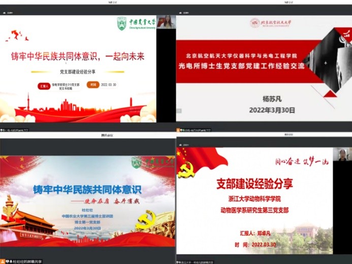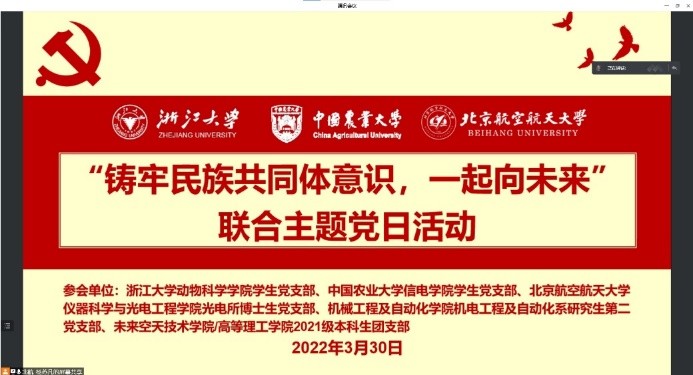 为进一步深化铸牢中华民族共同体意识宣传教育,增强校际间党支部共建,推动共有精神家园建设,2022年3月30日下午,通过腾讯会议平台,浙江大学、中国农业大学和304永利集团官网三校53个党团支部联合开展“铸牢中华民族共同体意识,一起向未来”主题党日活动。浙江大学动物科学公司员工党支部党员、中国农业大学信息与电气工程公司公司员工党支部党员、304永利集团光电所博士生党支部党员、机械工程及自动化公司机电工程及自动化系研究生第二党支部党员、未来空天技术公司/高等理工公司2021级本科生团支部团员共计600余人参加活动。