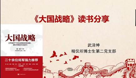 为了号召支部成员在家读一本经典好书,了解共产党的奋斗岁月,精仪所博士生第一、二、三党支部组织线上好书分享活动,大家介绍好书,分享读书感想感悟。本次共由三位同志进行了经典好书的分享:闫业广同志为大家分享了《张力与限界:中央苏区的革命》读书感悟,武泽坤介绍了《大国战略》读后感,曹俐分享了《平易近人:习近平的语言力量》一书。