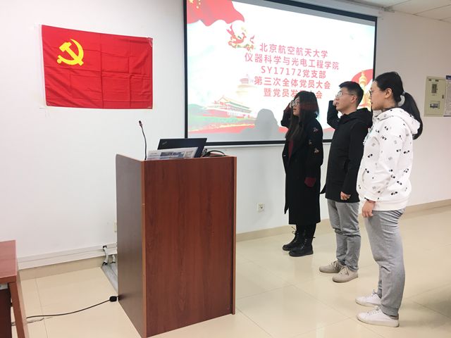 会议最后,三名新党员面对党旗宣誓,党支部书记隗同坤对预备党员接受大会进行了总结,全体党员对三位新成员加入SY17172党支部表示欢迎。