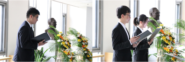 在接下来的环节中,士谔书院优秀学子代表张明远同学带领大家温情的回顾了林士谔先生光荣的一生。仪器公司优秀学子梁腾宇和士谔书院优秀学子丁小轩同学共同在林先生雕像前,深情的做《永恒》自创诗朗诵。