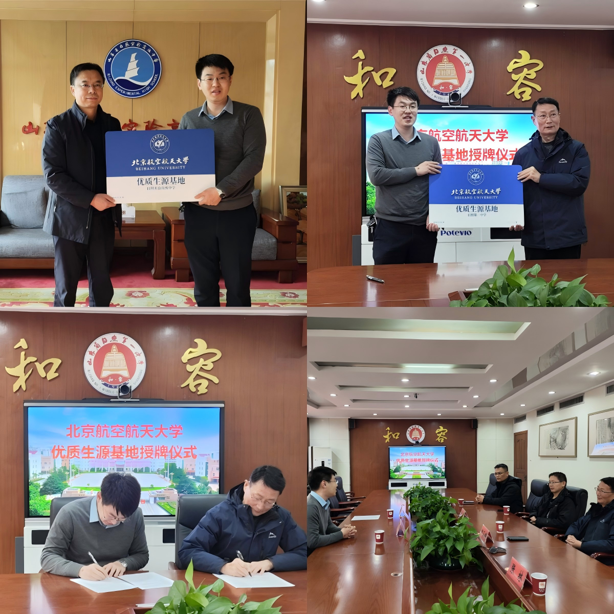 12月30日,招生组前往山东日照,副组长冀赵杰代表山东招生组与日照第一中学、日照实验高级中学分别签署优质生源基地中学合作协议,举行优质生源基地授牌仪式。招生组与两所中学的主要领导进行了深入沟通,详细介绍了北航办学特色与学科优势,了解了两所中学的生源概况,并初步商讨了后续大中衔接、人才协同培养的相关意向。今年正值日照一中百年校庆,山东招生组代表北航送上热烈祝贺,并期望后续与日照一中的合作可以源远流长。