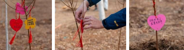 活动现场,专业人员在示范标准化植树流程后,师生分组领取工具展开实践。挥锹培土、扶苗固根、引水浇灌等环节衔接有序,新栽的树苗均悬挂定制木制祝福牌,寄语涵盖成长愿景、学业期许与生态承诺。