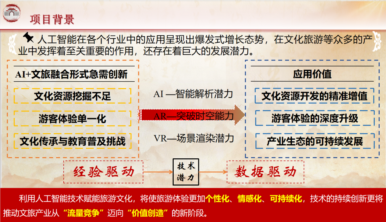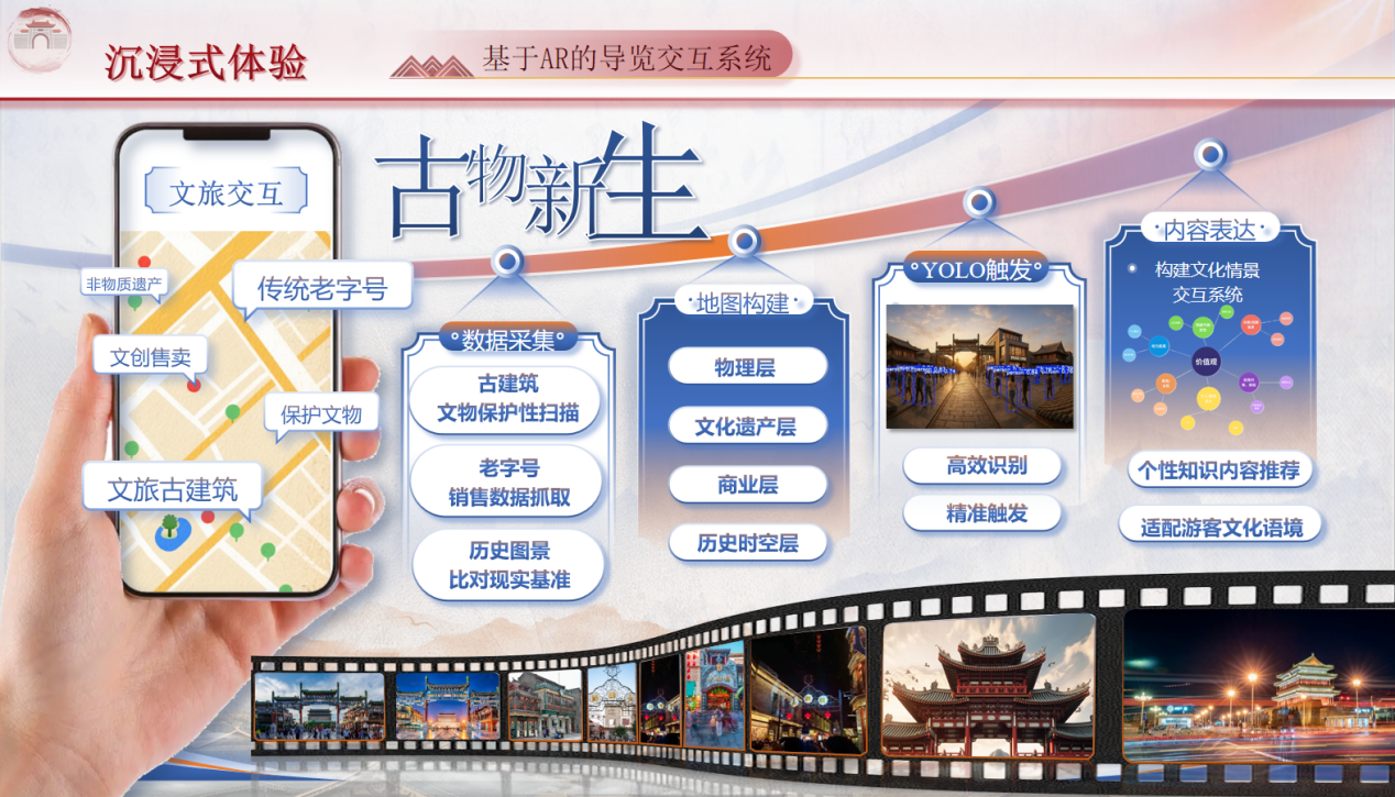 针对文化资源挖掘不充分、旅游体验同质化等行业痛点,本项目聚焦AI赋能旅游文化领域,选取前门北京坊这一知名旅游IP展开研究,寻求创新突破。研究围绕四大目标推进:深度挖掘文化内涵,精准提炼北京坊独特历史文化价值;优化游客体验,打造差异化旅游场景;提升个性化设计水平,满足游客多元需求;加强文化遗产传承,推动文化资源可持续利用。在技术层面,团队积极创新整合,构建“BERT +”联合模型、YOLO无标记AR触发技术等多项创新型融合算法方案,实现游客与文化场景无缝互动,为激活北京坊旅游文化产业文化深度、提升游客体验感提供有力支撑。