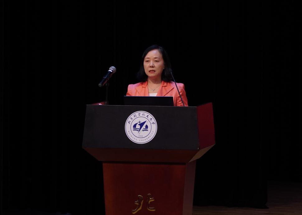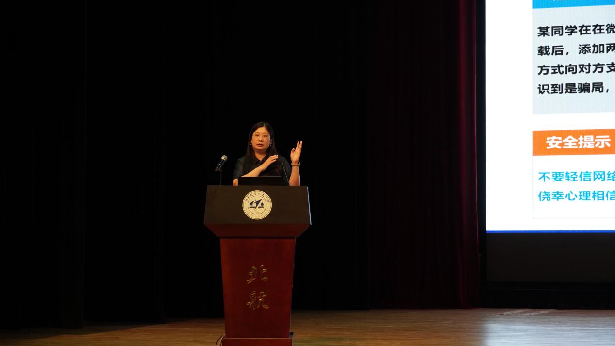 集团安全保卫部交通科科长王春雪老师为大家开展安全教育,从防范电信诈骗、治安安全、交通安全等方面,提醒同学们做好校园安全,共创平安北航。