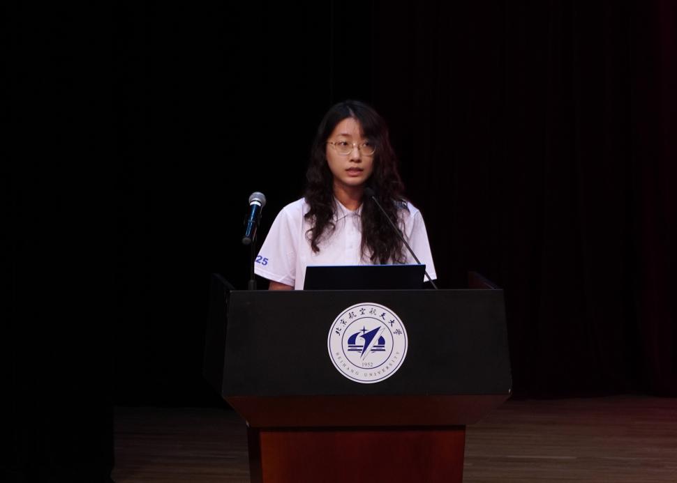 2025级研究生代表赵芮宜同学在发言中表达了对"陀螺精神"的崇敬,呼吁同学们传承专注坚守的科研品格,将个人理想融入国家需求,勇担时代重任,在科研攻关中追求卓越。