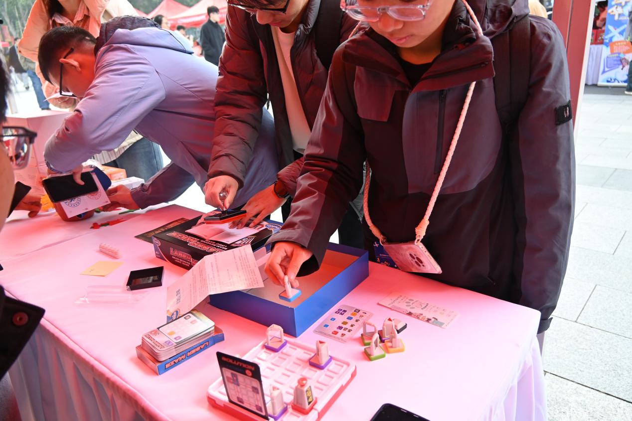 在仪光逐梦展位,师生可沉浸式体验三项趣味与智慧并存的互动游戏。磁力对抗游戏,需要参与者沉着冷静、缜密计算,同时考虑棋子之间的磁吸作用和棋盘上的紧张博弈;五子连珠则由双方轮流落子,任一方在横、纵、斜向连成五子即获胜,更需要纯粹的判断和计算;方言接力则需要三人组队用方言传递题目,对默契和知识量都有极高要求,乐趣非凡。